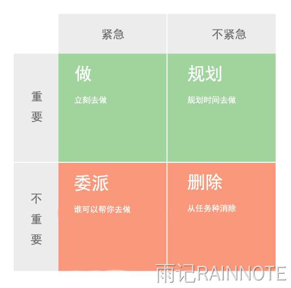 如上图所示的矩阵被称之为叫做艾森豪威尔矩阵,矩阵的横轴意味着任务的紧迫性而竖轴则意味着任务的重要性。紧急二重要的任务是要被有限处理的任务,需要将这些任务的优先级排在最前面。其次是重要但是并不紧迫的任务,虽然这些任务短时间不被完成不会产生什么非常严重的后果,但是这些任务是我们实现长期目标中的重要一环,在优先级上是优先于其他的任务仅次于重要并且紧迫的任务的。
