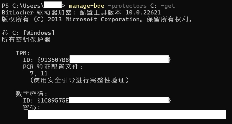 在开始菜单图标上右击,然后点击“终端管理员”,并输入manage-bde -protectors C: -get(请直接复制这一条命令)并回车。你将会看到如下图的结果: